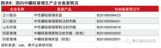 国内企业相继布局中硼硅玻璃瓶,但上游中硼硅玻璃管依然严重依赖进口。一批国产企业相继开展中硼硅玻璃瓶生产。根据包材备案登记号,山东药玻、正川股份、四星玻璃等公司已经取得包材备案登记号。然而,尽管国内企业可生产中硼硅玻璃瓶,但原材料——中硼硅玻璃却严重依赖进口。中硼硅玻璃瓶的生产分为两步,第一步是生产出中硼硅玻璃管,之后将玻璃管送至玻璃瓶生产商,最后加热玻璃形成最终的玻璃瓶。加工成为玻璃瓶的难度不高,但中硼硅玻璃管的自主生产难度较大。山东药玻半年报披露,为了降低中硼硅玻璃管制瓶的生产成本,公司在上半年进行了中硼硅玻璃管的自主研发。在研发过程中,外观方面存在的主要缺陷是气泡线、结瘤,尺寸方面存在的缺陷主要是外径稳定性差。公司表示,因中硼硅玻璃技术研发难度大,存在不确定性,故目前的模式仍是购买国外的中硼硅玻璃管,公司再制作硼硅管系列瓶和中硼硅安瓿瓶。目前,沧州四星玻璃已率先打破国外的垄断,2019年,四星玻璃采用国际先进、节能、环保的“全电熔维洛法”技术研发的中性硼硅玻璃管成功上市,使公司成为国内第一家能够批量生产5.0药用中性硼硅玻璃的企业。