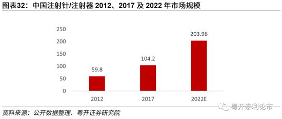 注射针/注射器主要用于对人体肌肉、皮下、静脉注射药液用,疫苗的接种主要使用注射针/注射器。由于注射针/注射器广泛应用于药物的输注治疗,而输注治疗作为临床上最常规的治疗手段,在就诊及住院患者中使用非常广泛,因此注射针/注射器是临床中最常规的医疗器械,市场需求量巨大。2012年,中国注射针/注射器市场规模在138.7 亿支左右,约合 59.8 亿元人民币,在未来十年内其使用数量的复合年均增长率有望达到12.4%,金额的复合增长率将达到11.8%。