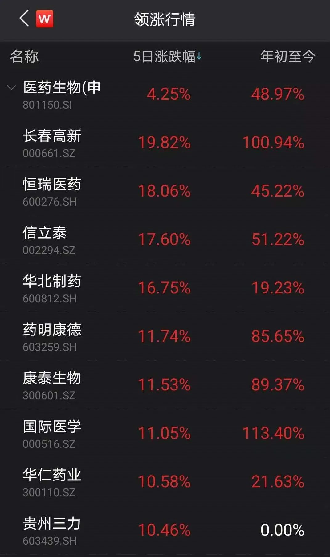 在8月初创下年内高点后,医药生物板块便开始持续回调,但进入12月板块出现止跌企稳迹象:本周医药生物板块累计上涨4.25%,较11月底已累计反弹8.03%。从个股看,本周通策医疗、恒瑞医药、爱尔眼科、泰格医药等多只个股盘中股价创历史新高,长春高新、恒瑞医药、信立泰、华北制药等9只个股周涨幅超10%。