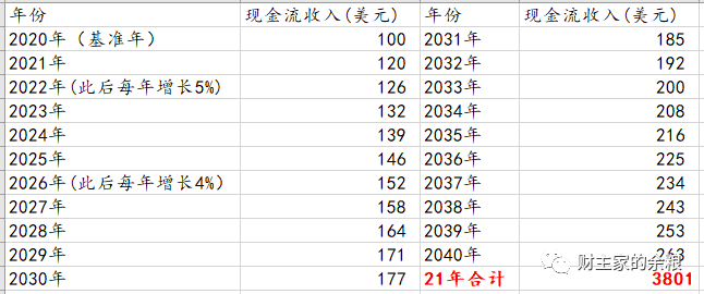 100多年来,标普500市盈率平均值在21左右,所以假定标普指数年度盈利一直计算到2040年,然后将这些现金流相加,就可以得出标普500现在的价值应该是多少。
