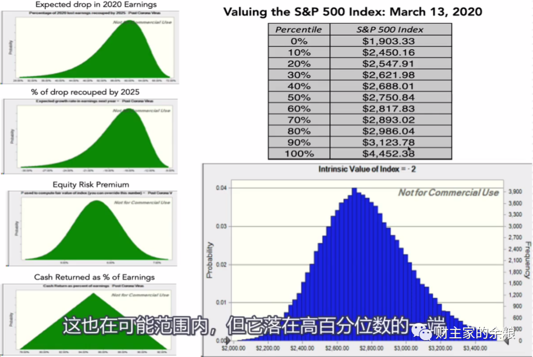 例如,就在危机最严重的3月18日,达摩达兰对于标普500指数进行了估值,考虑到疫情影响、现金回报、风险溢价等情况,他认为当时的标普估值,中位值应该在2750附近,而最高不应超过4452点,最低不应该低于1903点。