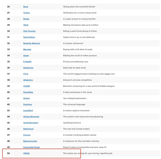 今年6月,UiPath入选了《CNBCDisruptor 50》榜单。作为全球排名第一的财经媒体,CNBC评选出了那些对商业模式和市场竞争环境,做出巨大贡献的创新科技企业。