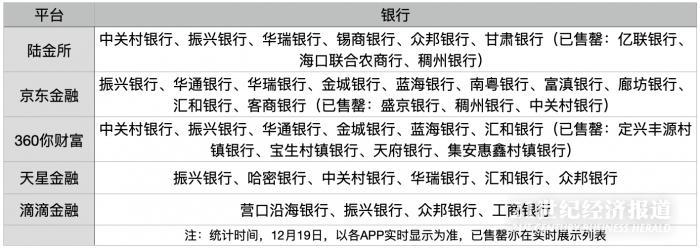 12月19日,21世纪经济报道记者根据各家银行实时展示的情况梳理,截至目前仍有陆金所、京东金融、360你财富、天星金融、滴滴金融等APP有存款产品在售。