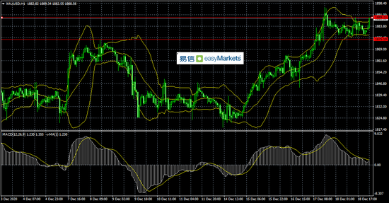 技术上看黄金在1875美元位置支撑不破,现在又快速有力反弹,似乎短线多头力量较强。只不过黄金来到了关键箱体压力1890美元位置,现在就看日内是否能突破,突破的话黄金看到1900美元可能性很大。小时突破看黄金下方支撑是布林线中轨1880美元附近,上方黄金形态偏强,对应策略也是逢低多为主。而跌破1880的话,以为这黄金将重新看1875美元附近支撑。
