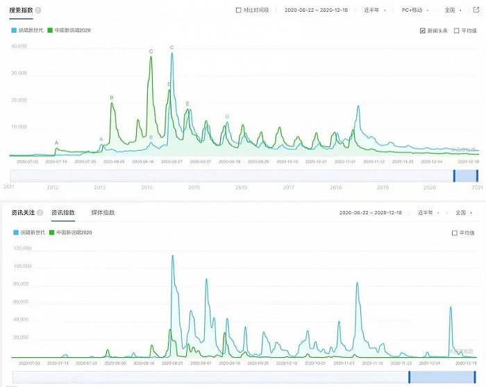 百度指数显示,近半年,《说唱新世代》百度搜索指数峰值为38399,《中国新说唱2020》36953,在百度资讯指数、媒体指数这两项上,《说唱新世代》也均处于领先位置;另一边,B站第三季度的广告业务收入同比增长126%,达5.6亿元,月活跃用户规模同比增长54%,8月的月活跃用户数更破2亿,平均月付费用户同比接近翻倍。