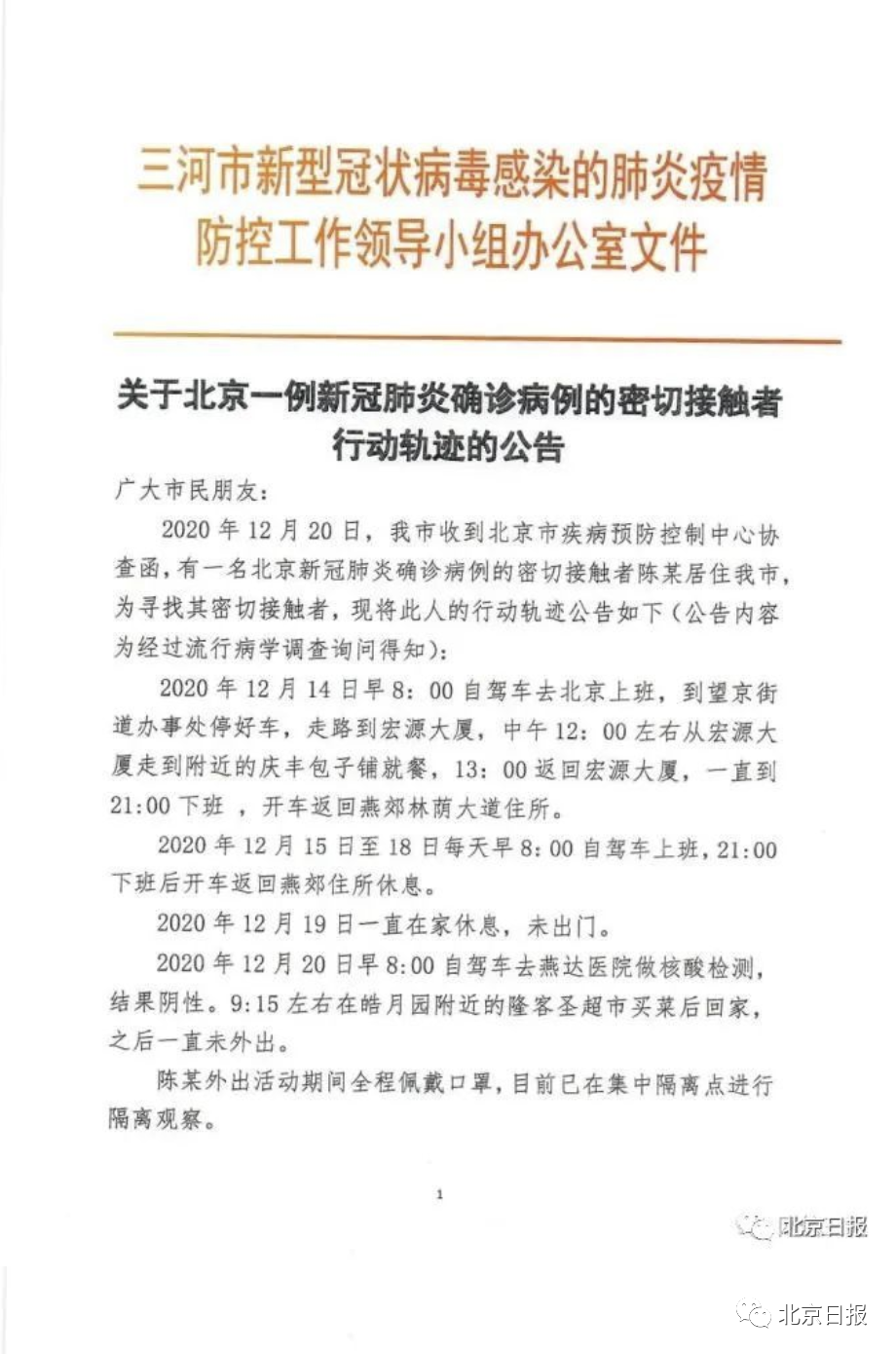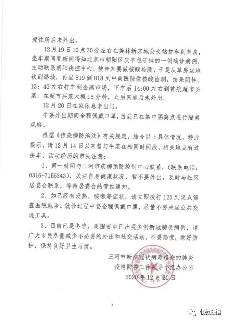 12月20日,河北省三河市新型冠状病毒感染的肺炎疫情防控工作领导小组办公室发布《关于北京两例新冠肺炎确诊病例的密切接触者行动轨迹的公告》,称有两名北京新冠肺炎确诊病例的密接者居住在三河市,并公布两人的行动轨迹。