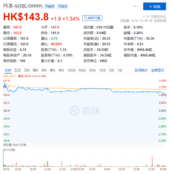 截止港股今日收盘,网易股价涨1.34%,报143.8港元。