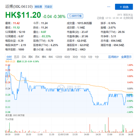 截止港股今日收盘,滔博股价跌0.36%,报11.2港元。