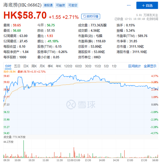 截止港股今日收盘,海底捞股价涨2.71%,报58.7港元。
