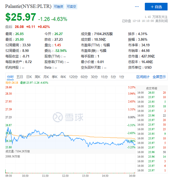 截止12月18日美股收盘,Palantir股价跌4.63%,报25.97美元。