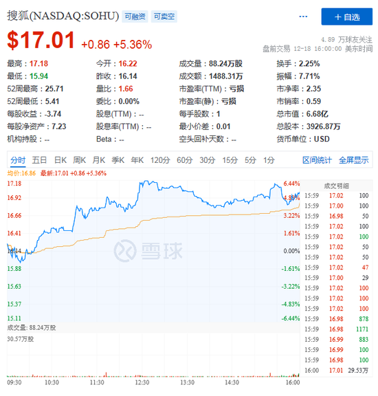 截止12月18日美股收盘,搜狐股价涨5.36%,报17.01美元。