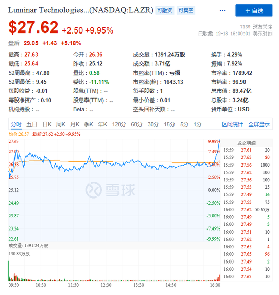 截止12月18日美股收盘,Luminar股价涨9.95%,报27.62美元。