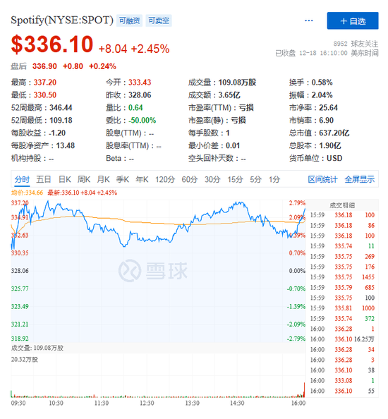截止12月18日美股收盘,Spotify股价涨2.45%,报336.1美元。