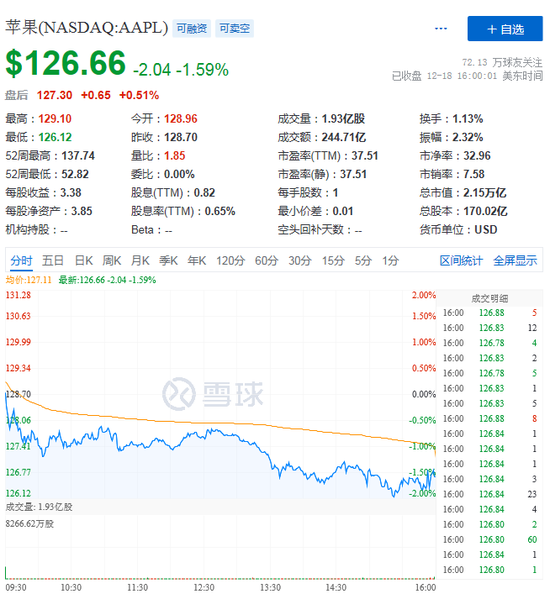 截止美股12月18日收盘,苹果股价跌1.59%,报126.66美元。