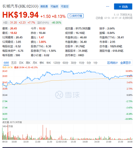 截止港股今日收盘,长城汽车股价涨8.13%,报19.94港元。