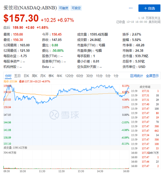 截止美股12月18日收盘,爱彼迎股价涨6.97%,报157.3美元。