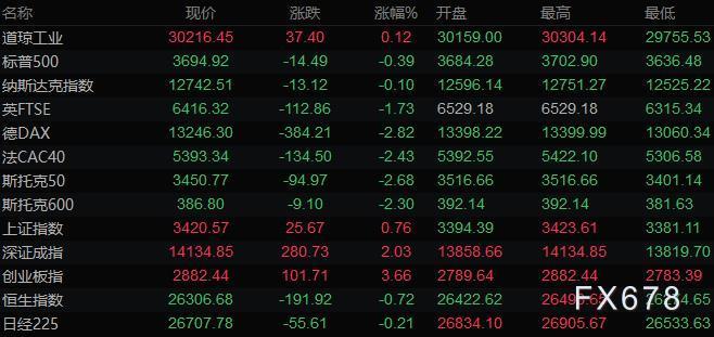 美股三大指数收盘涨跌不一,道琼斯指数指数收盘上涨37.40点,涨幅0.12%,报30216.45点;