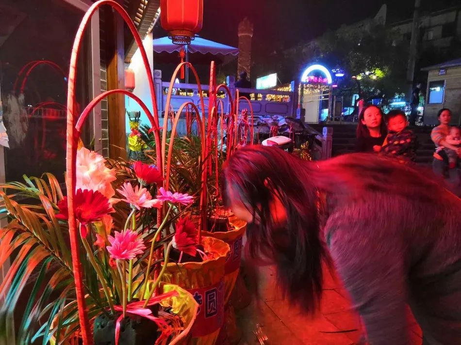 一个夜晚,唐慧在自家饭店门口插花篮到深夜。澎湃新闻记者 明鹊 图