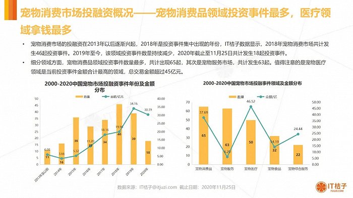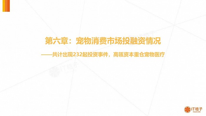 蓬勃发展的宠物市场也引起了资本的关注,IT 桔子数据显示,至今宠物消费市场共计发生超过 232 起投资事件,其中,宠物消费品领域投资事件数量最多,共计 65 起,宠物医疗领域融资金额最高,约合 46.52 亿元。