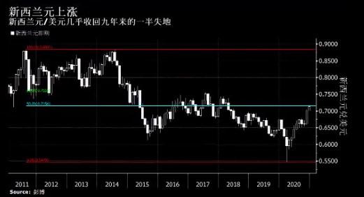 已突破0.7156,这是2011-2020年高点至低点走势的50%回撤位。从此处的回调幅度很小。若月线收于该水平之上,汇价将看向2017年7月的高点0.7558,与61.8%斐波那契回撤位0.7555相邻。