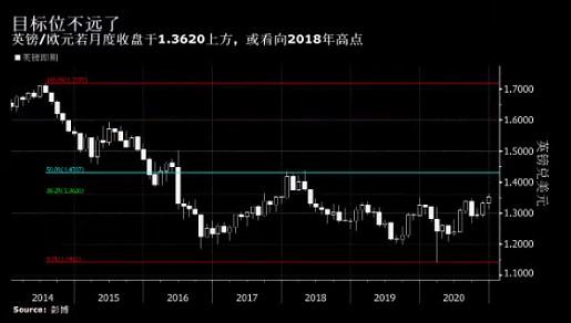 已试探2014-2020年跌势的38.2%斐波那契回撤位1.3620。若收盘突破这个水平,将试探在2018年1月的1.4345和4月的1.4377这两大关键高位附近的强烈阻力位。