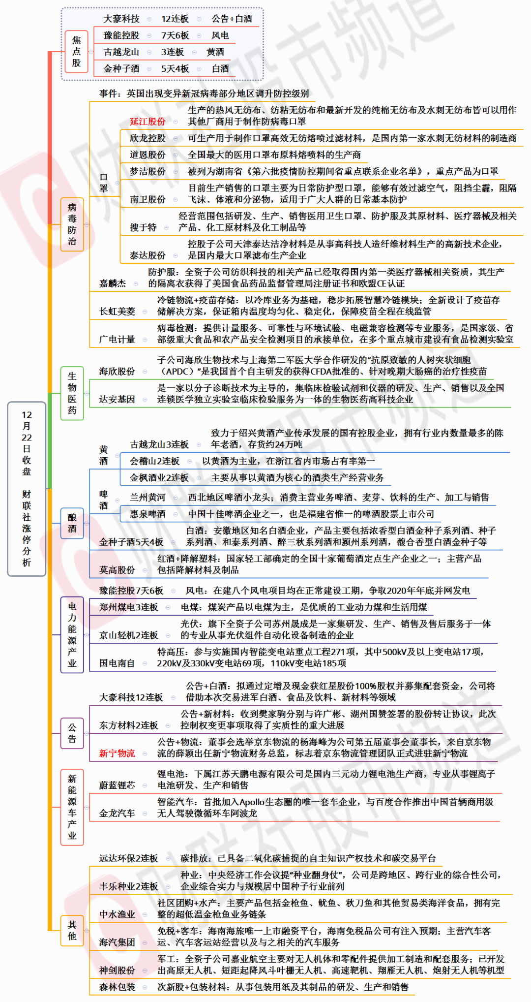 抗病毒方面,口罩股领涨,梦洁股份率先上板,泰达股份涨停后带动整个口罩板块的人气,欣龙控股、道恩股份、南卫股份、搜于特、延江股份、嘉麟杰等纷纷涨停,并且带动了以岭药业、红日药业等人气中药股。驱动方面,主要是英国新冠病毒的变异,该消息周末已经有报道,但是国内热度不高,直到欧股开盘大跌,该事件谈论热度快速上升。该类个股,目前主要以低位反弹看待,大部分标的相对上半年的高点已经腰斩,比较适合做反抽先手吃后手,后续接力以资金博弈为主。