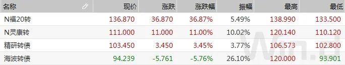 受A股大跌影响,转债行情急转直下,逾七成转债下跌。虽然整体行情不佳,但仍有多只转债受到资金爆炒,加上新债密集上市,转债市场再度上演临停潮。中证转债指数收盘跌0.59%,四只新债表现分化,福20转债大涨近37%,海波转债则跌近6%,成为逾一年来首只上市首日便破发的转债。