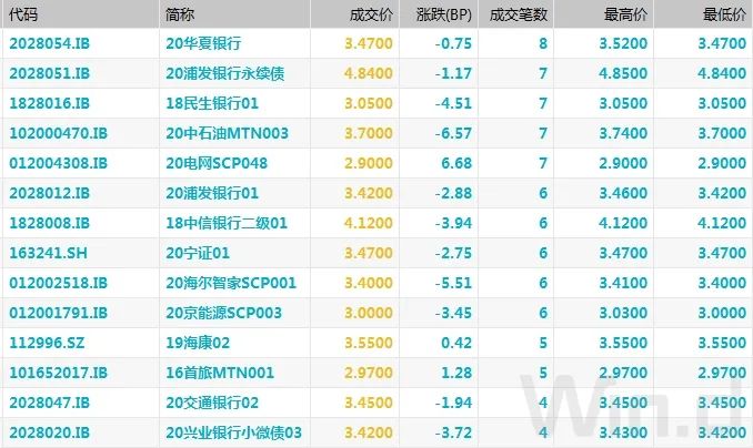 银行间主要利率债收益率下行3-4bp。10年期国债活跃券200016收益率下行3.5bp报3.230%,5年期国债活跃券200013收益率下行3.5bp报3.0250%,2年期国债活跃券200011收益率下行2.25bp报2.8450%。交易员称,周二利率继续明显的下行,股市和商品期货走弱,利好债券利率的下行,而央行继续大规模投放跨年资金,资金利率下行也推动了债券利率的下行。