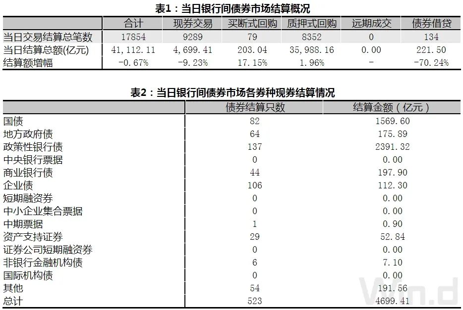 12月22日,全国银行间债券市场结算总量为41,112.11亿元,较上日下降0.67%,交易结算总笔数为17854笔。其中,质押式回购35,988.16亿元,买断式回购203.04亿元,现券交易4,699.41亿元,债券借贷221.50亿元。银行间债券市场回购利率以下行为主,其中,7天回购利率下行3.5bp至2.183%。