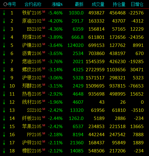 热点栏目12月23日,国内期市早盘大面积下跌,黑色系大幅波动,铁矿石一度跌破千元,截止目前,铁矿石跌逾5%,原油、苯乙烯跌逾4%,动力煤、沪镍、沥青、燃油跌近4%,螺纹、沪银、甲醇跌逾3%;涨幅方面,纸浆逆势涨逾2%,淀粉、菜粕、玉米涨逾1%。