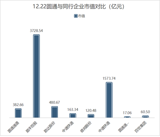 对比顺丰速运也在12月19日披露了其11月的经营数据,快递营业收入从2019年111.85亿元上升为今年146.42亿元,同比上涨30.91%,业务量上涨59.51%,单票收入从19.69元下降到16.16元,同比下降17.93%;同期韵达股份单票收入为2.34元,同比下降28.66%。整个快递行业价格竞争激烈,单票利润承压成为普遍现象。根据同花顺数据库统计12.22日圆通速递同行可对比企业市值来看,圆通速递排名位于顺丰控股、中通快递、韵达股份之后,分别为3728.54亿元、1573.74亿元、480.67亿元、382.66亿元。