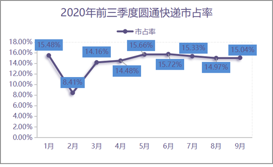 前三季度,圆通速递市占率总体维持在15%左右,其中二月跌至最低点8.41%,变动幅度较大,维持市占率存在挑战。今年11月,A股四大快递企业顺丰、圆通、申通和韵达的市占率分别为9.31%、15.82%、10.41%和16.26%。