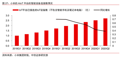 中信证券分析称,小米手机×AIoT战略清晰,具有较强先发优势,亦牢牢占据高端用户和市场。截至2020年Q3,小米AIoT平台设备连接数已高达2.90亿(同比+35.8%),米家App月活4310万(同比+34.2%)。