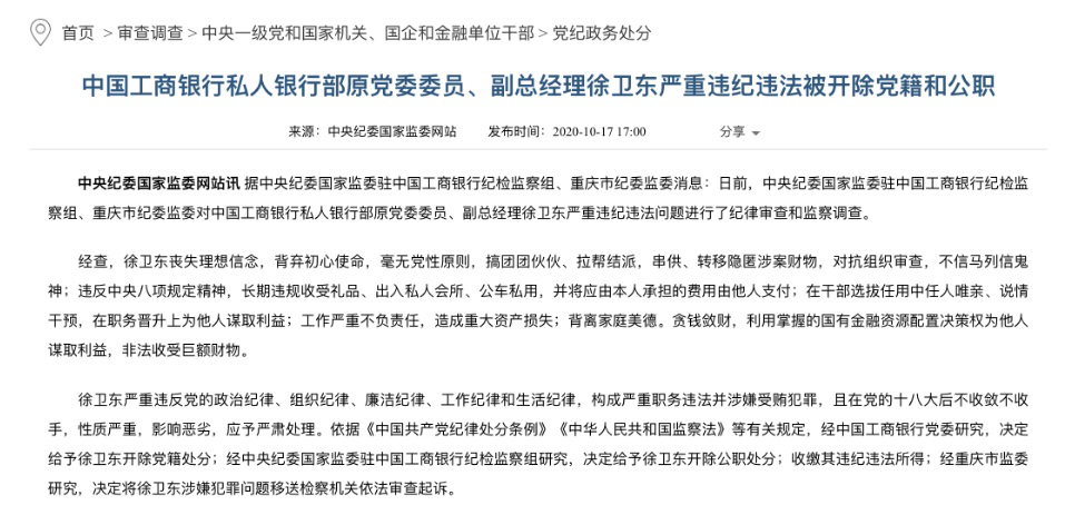 例如,中国工商银行私人银行部原党委委员、副总经理徐卫东,经查,徐卫东丧失理想信念,背弃初心使命,毫无党性原则,搞团团伙伙、拉帮结派,串供、转移隐匿涉案财物,对抗组织审查,不信马列信鬼神;违反中央八项规定精神,长期违规收受礼品、出入私人会所、公车私用,并将应由本人承担的费用由他人支付;在干部选拔任用中任人唯亲、说情干预,在职务晋升上为他人谋取利益;工作严重不负责任,造成重大资产损失;背离家庭美德。贪钱敛财,利用掌握的国有金融资源配置决策权为他人谋取利益,非法收受巨额财物。