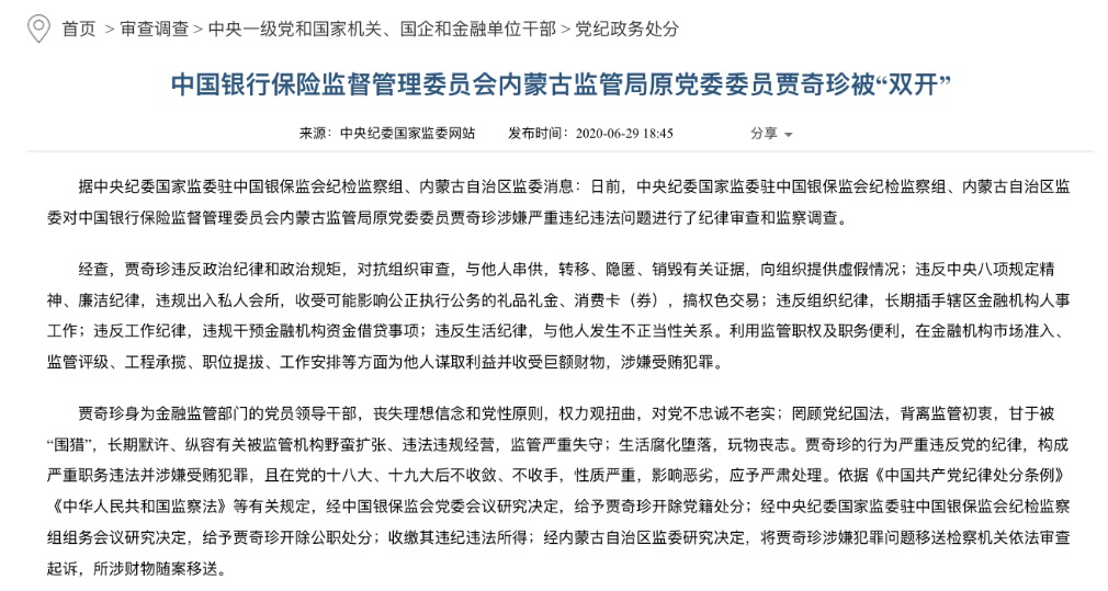 例如,中国银行保险监督管理委员会内蒙古监管局原党委委员贾奇珍,经查,贾奇珍违反政治纪律和政治规矩,对抗组织审查,与他人串供,转移、隐匿、销毁有关证据,向组织提供虚假情况;违反中央八项规定精神、廉洁纪律,违规出入私人会所,收受可能影响公正执行公务的礼品礼金、消费卡(券),搞权色交易;违反生活纪律,与他人发生不正当性关系等。