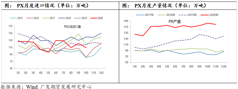 从2020年亚洲PX供需来看,2020年全球PX装置投产不多,大概380万吨,包括年初浙石化另一条线200万吨投产以及8月底富海100万吨新装置投产,另外,中化泉州80万吨预计12月投产;而下游PTA今年投产840万吨,远高于PX产能增幅。但是因2019年亚洲PX投产较多,如果综合2019-2020年的整体供需来看,PX产能增加1290万吨(990+300);PTA产能增加1280万吨(440+840),折合PX消耗838万吨,单从产能增幅上看,亚洲PX仍处于过剩状态。截止2020年11月,中国PX产能达2603万吨,较2019年底增长13%;1-11月国内PX产量1856万吨,同比增长42%;1-10月国内PX进口1174.1万吨,同比下降6.3%,虽然今年PX进口下降较多,但是因海外疫情影响,今年整体进口仍超预期。