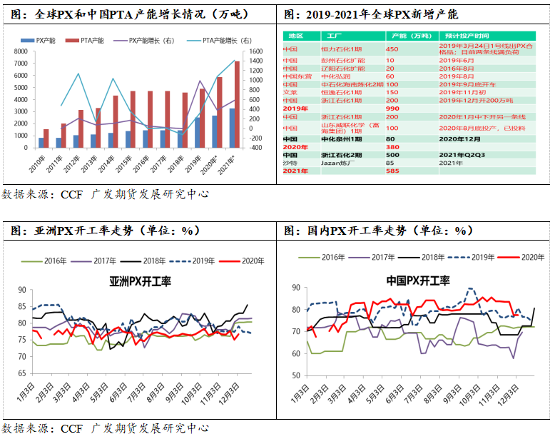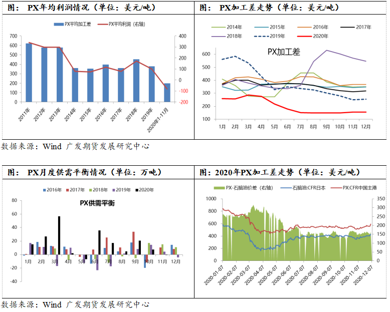 2021年PX产能增量低于下游PTA产能增量,预计PX整体供需有所好转,PX加工费有所修复,PX加工费区间可能在150~250美元/吨,节奏关注2021年PX去库情况以及浙石化的投产时间。