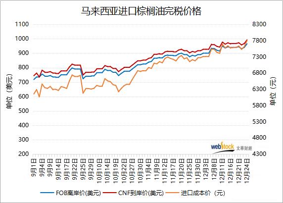 12月24日马来西亚棕榈油离岸价为965美元,较上日涨25美元,进口到岸价为992美元,较上日涨25美元,进口成本价为7797.17元,较上日涨184.68元,连续第二日上涨,刷新阶段高位。因阿根廷油籽工人罢工事件推升CBOT豆油期货价格,为棕榈油市场提供溢出支撑,加之国际原油价格止跌反弹,马来西亚BMD毛棕榈油期货周三收盘涨逾3%,期价突破3500令吉,再创本轮新高,棕榈油进口成本跟盘大幅上调。
