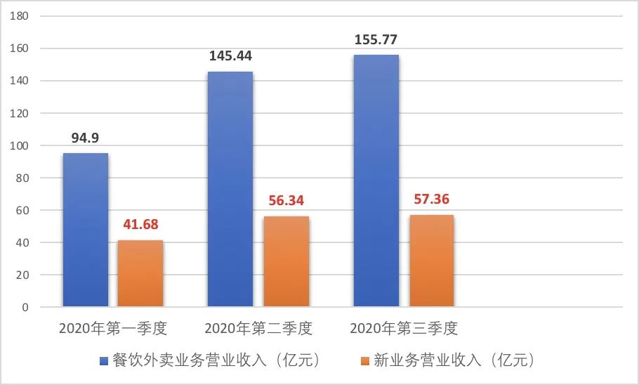 今年以来,美团餐饮外卖业务各季度所贡献的营收同样远高于新业务,三个季度增加超60亿元,而同时期新业务仅增加约10亿元。