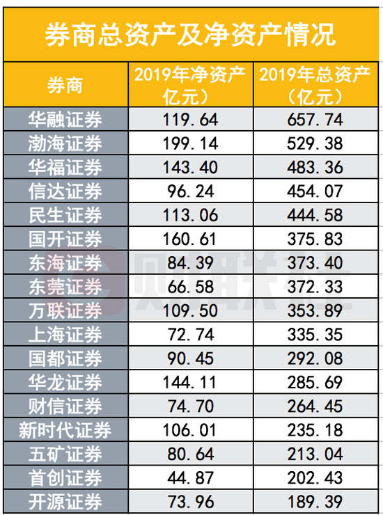 净资产来看,渤海证券(199.14亿)、国开证券(160.61亿)、华龙证券(144.11亿)、华福证券(143.4亿)、华融证券(119.64亿)则位列前五。