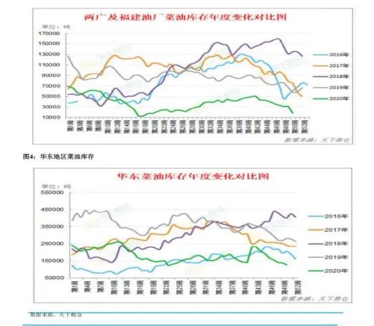 库存方面,整体来看,当前的市场库存依然处于一个偏低的水平,根据天下粮仓数据显示,截至12月11日当周,两广及福建地区菜油库存下降至18500吨,较上周31500吨减少13000吨,降幅41.27%。较去年同期57700吨,降幅67.94%。本周华东总库存在136800吨,较上周147000吨减少10200吨,降幅6.94%,较2019年291200吨减少154400吨,降幅53.02%。综合来看,菜油库存短期仍然处于偏低位置。