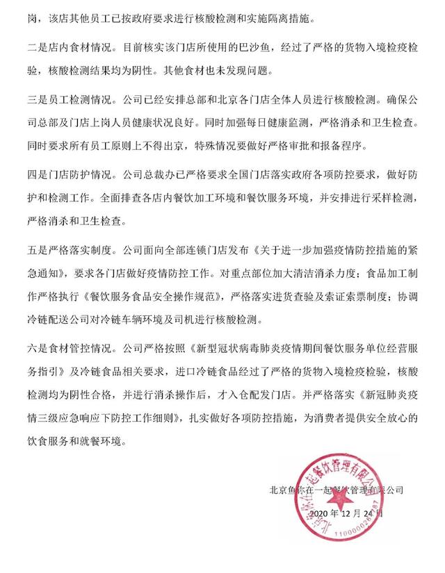 12月24日晚,北京“鱼你在一起”餐饮管理有限公司通过其官方微信公众号发布声明,称涉事门店为加盟店,公司在12月23日晚已经启动疫情防控应急预案。叶某为新入职该门店两周的员工,该店其他员工已经按照要求进行核酸检测和实施隔离措施。