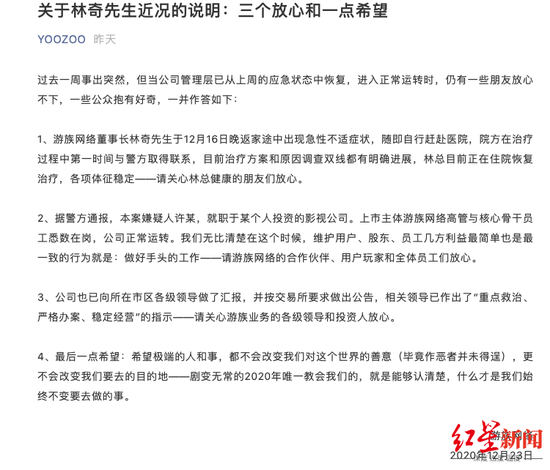 12月23日晚,在上海警方发布警情通报的一个小时后,游族网络终于对林奇住院作出了说明。