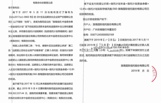 据了解,徐子泉在信托存续期间并未履行相应的补仓、差额补足义务,累计拖欠9.59亿元保证金。2019年9月18日,信托计划委托人新时代证券(实际为广州农商行)通过渤海信托发函徐子泉,要求其履行回购中金君合有限合伙份额的承诺,并支付16.11亿元回购款。