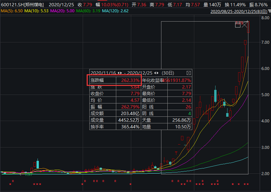 25日,郑州煤电再度涨停,近30个交易日涨幅达260%。