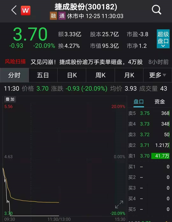 25日早间,捷成股份开盘不到15分钟就快速跌停。截至发稿,捷成股份下跌20%,42万手卖单把股价死死地摁在跌停板上,成交金额超3亿元。