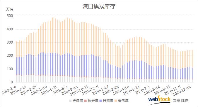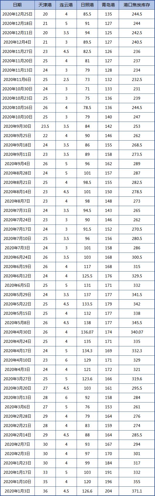 以下为2020年1月以来国内港口焦炭库存总量及天津港、连云港、日照港和青岛港库存(万吨)