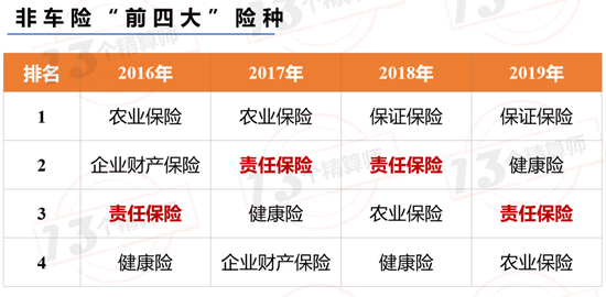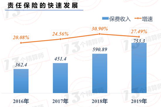 责任保险,一直是非车险的前三强,近四年的保费增速也保持高位,在20%左右。