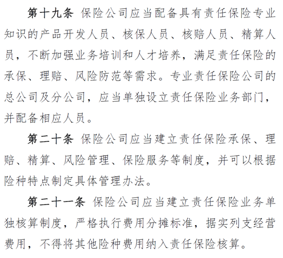 对险企开展责任险的业务管理、授权体系、队伍建设、业务核算、信息系统、数据统计、风险管控等方面,监管也都有要求。
