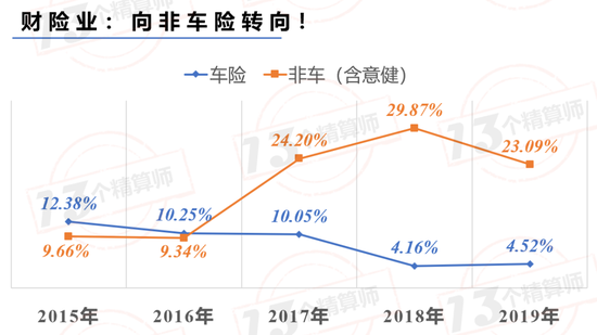 反观,非车险增速却逐年提升,其在财险业的份额也逐年上升,从2010年的25.4%,上升至2019年末的37%,近十年份额提升了12个百分点。
